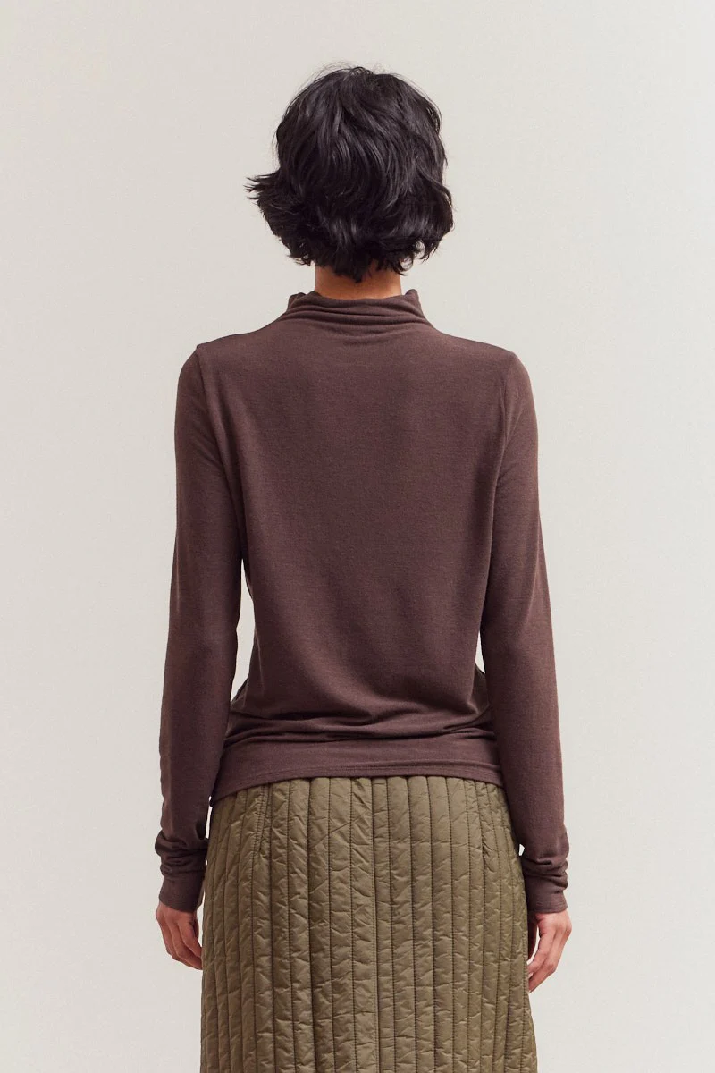 A sleek layering essential with a refined edge. The Salvatrix Top features a soft mock neckline, fitted silhouette, and extra-long sleeves for a subtly ruched effect. Made from a smooth, stretch-infused jersey, it offers everyday comfort with a polished finish—perfect worn alone or as a base layer.