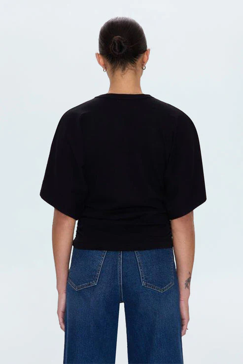 The perfect tee for the season. Veronica delivers a relaxed dolman shape with drop shoulders that transitions to a fitted silhouette through side cinching. The bodycon effect feels intentional, while the shirttail hem adds subtle movement. Crafted from a 100% cotton compact jersey that holds its shape and feels luxuriously soft against the skin. Noir brings timeless black sophistication that elevates any look, great for layering or standing alone.