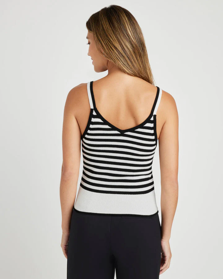 The Santina Stripe Sweater Tank is made from a soft cotton blend and features a deep V-neck and fixed spaghetti straps. Its cropped design, combined with contrasting borders, adds a playful modern touch for a perfect blend of casual-meets-classic.